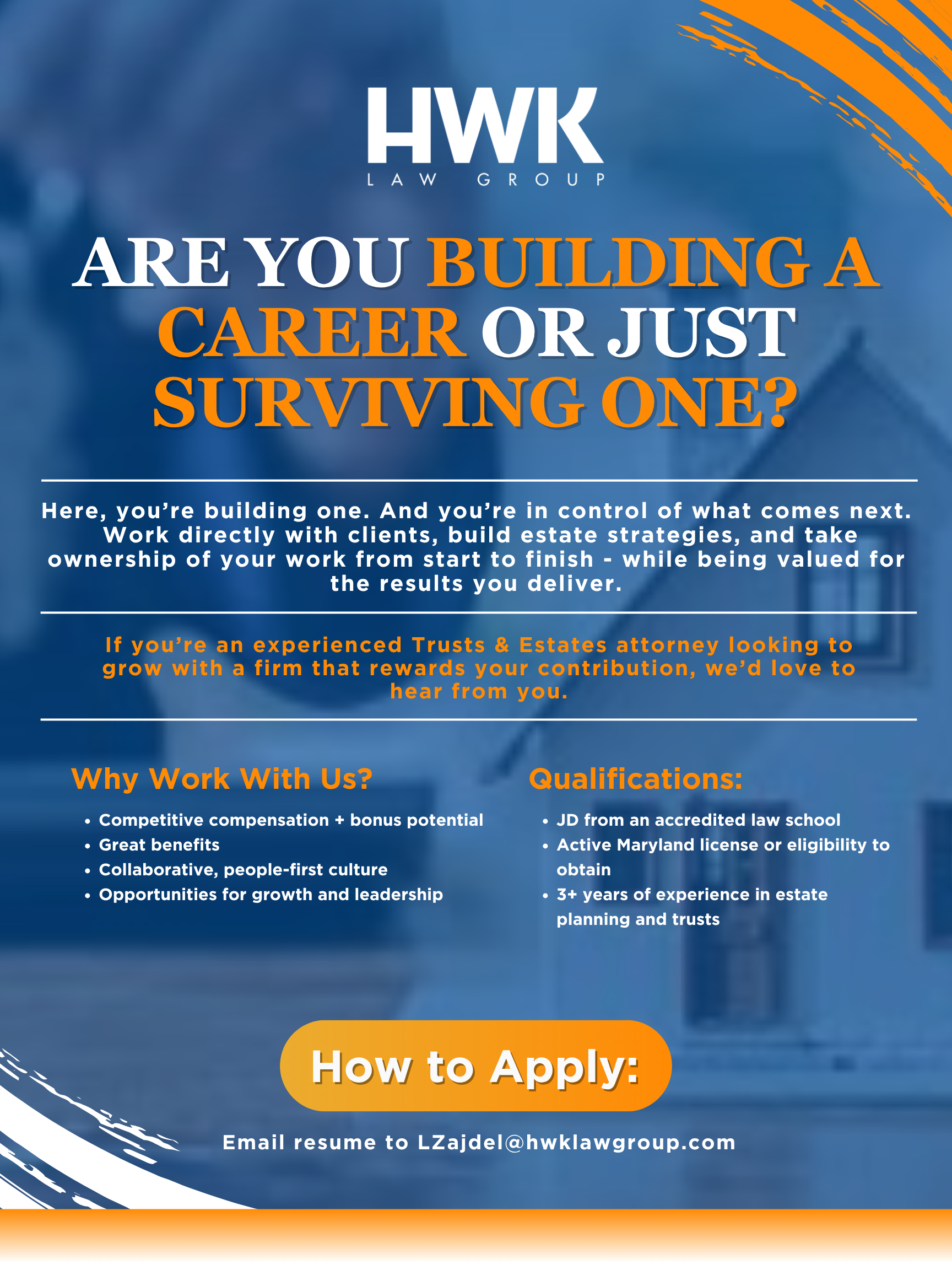 Join a team that values excellence, collaboration, and a commitment to serving our clients with integrity. At HWK Law Group, we provide a dynamic and supportive environment where professionals can grow, make an impact, and be part of a firm that truly cares. Whether you’re an experienced attorney, a paralegal, or a dedicated support staff member, we invite you to explore opportunities to join our team and build a fulfilling career with us.